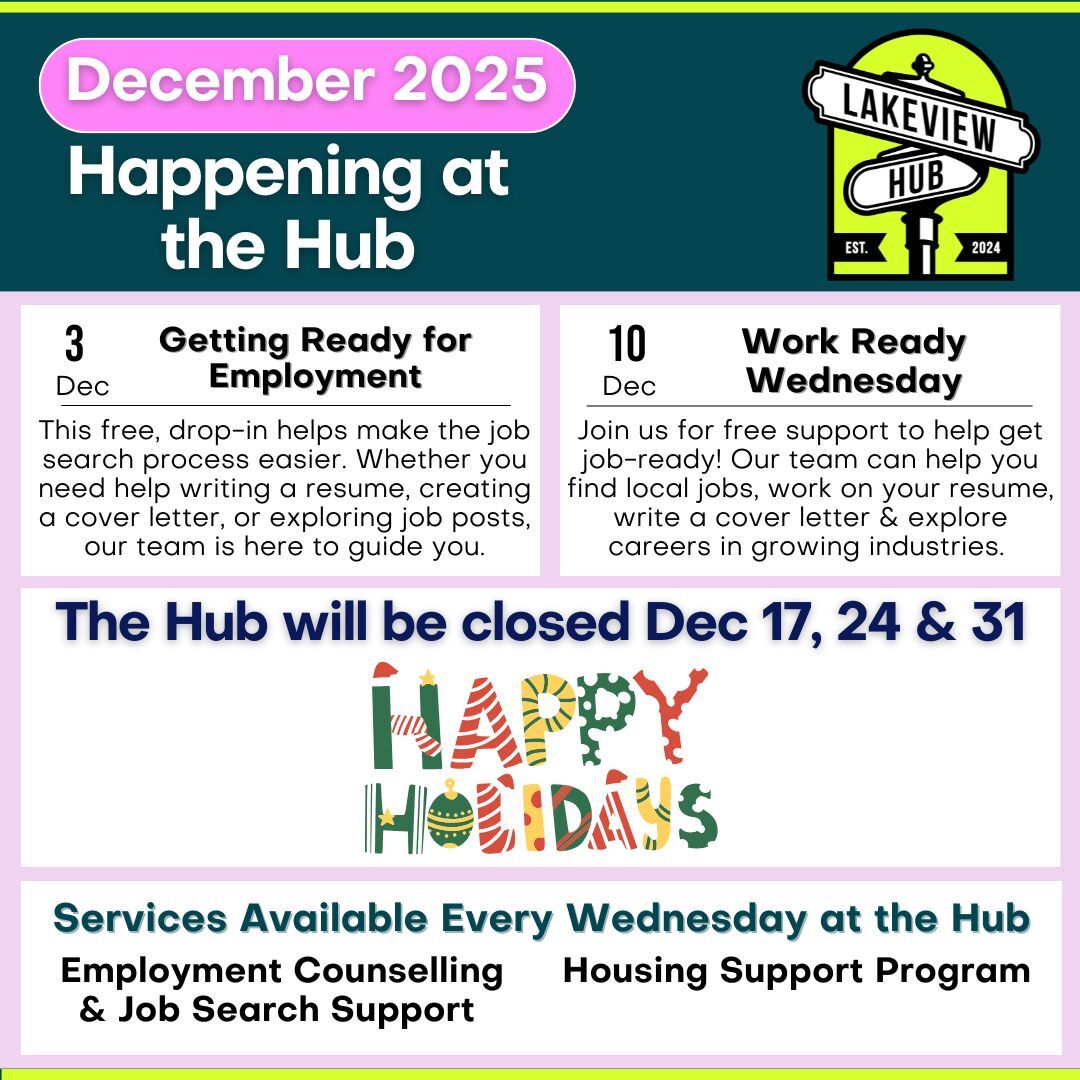 Looking for work or need help with your job search? Donβt miss the final Getting Ready for Employment drop-in of October at the Lakeview Hub. Meet one-on-one with an employment counsellor and get the support you need to move forward.
